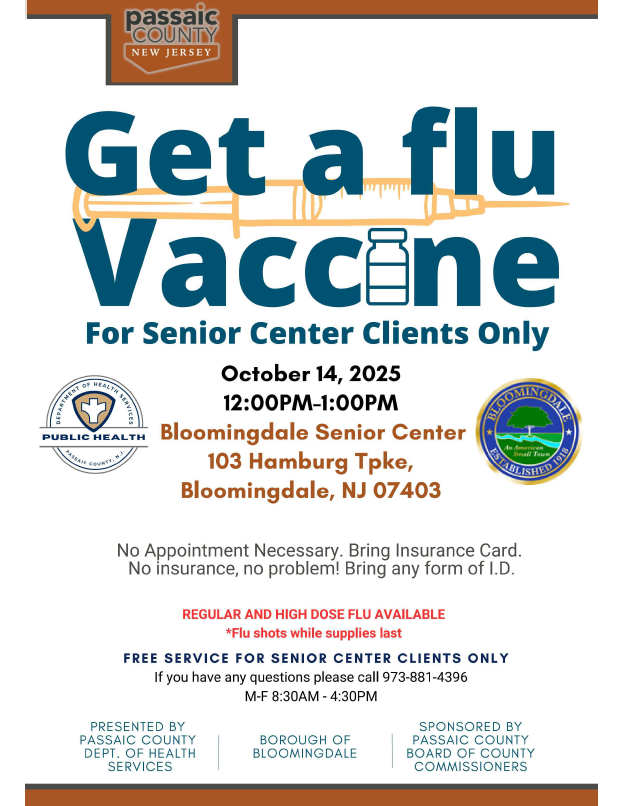 The Senior Center is also the home of a Passaic County Nutrition Site which operates Monday through Friday from 9:00 a.m. to 1:00 p.m. and serves a hot, nutritious meal to all Seniors over the age of 60 for a suggested donation of $1.25. Passaic County Para-Transit provides transportation. For information or reservations, please call Steve at the Senior Center at 973-835-4433.