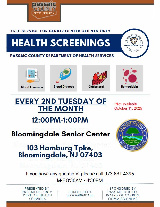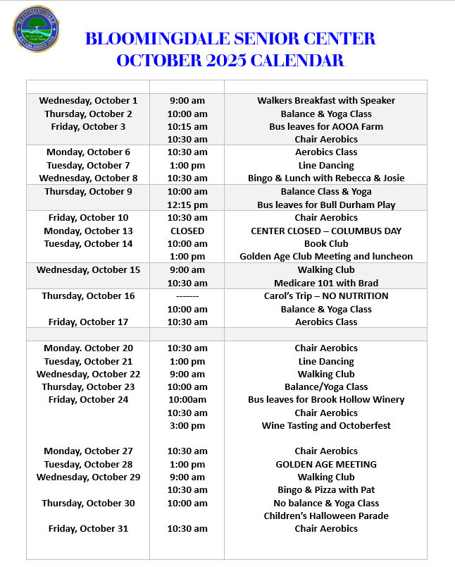 Stop by the Senior Center weekdays between 9:00 a.m. to 1:00 p.m. and pick up a monthly calendar of events or visit the Senior Center page on the Borough’s website at www.bloomingdalenj.net